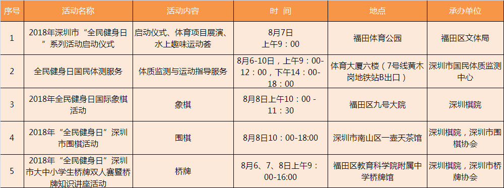 為迎接今年8月8日第十個(gè)全國“全民健身日”,增強(qiáng)全民健身意識(shí),培養(yǎng)良好的體育鍛煉習(xí)慣,在全社會(huì)形成崇尚健身、參與健身、支持和推動(dòng)全民健身事業(yè)發(fā)展的良好環(huán)境和氛圍,為構(gòu)建和諧社會(huì)發(fā)揮積極的作用,深圳市體育中心積極開展全民健身日免費(fèi)開放系列活動(dòng),于8月8日免費(fèi)開放(深圳體育館、深圳游泳跳水館、深圳網(wǎng)球中心、深圳體育場(chǎng)等四家體育場(chǎng)館,田徑、籃球、廣場(chǎng)體育、游泳、保齡球、壁球和網(wǎng)球7個(gè)項(xiàng)目。